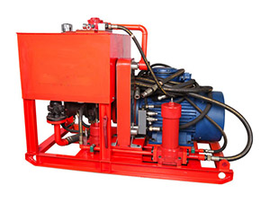 全液压钻机泵站是钻机的动力源,由防爆电动机、主油泵、副油泵、油箱、冷却器、滤油器、底座等部件组成。电动机通过弹性联轴器带动油泵工作,从油箱吸油并排出高压油,经操纵台驱动钻 机的各执行机构工作。